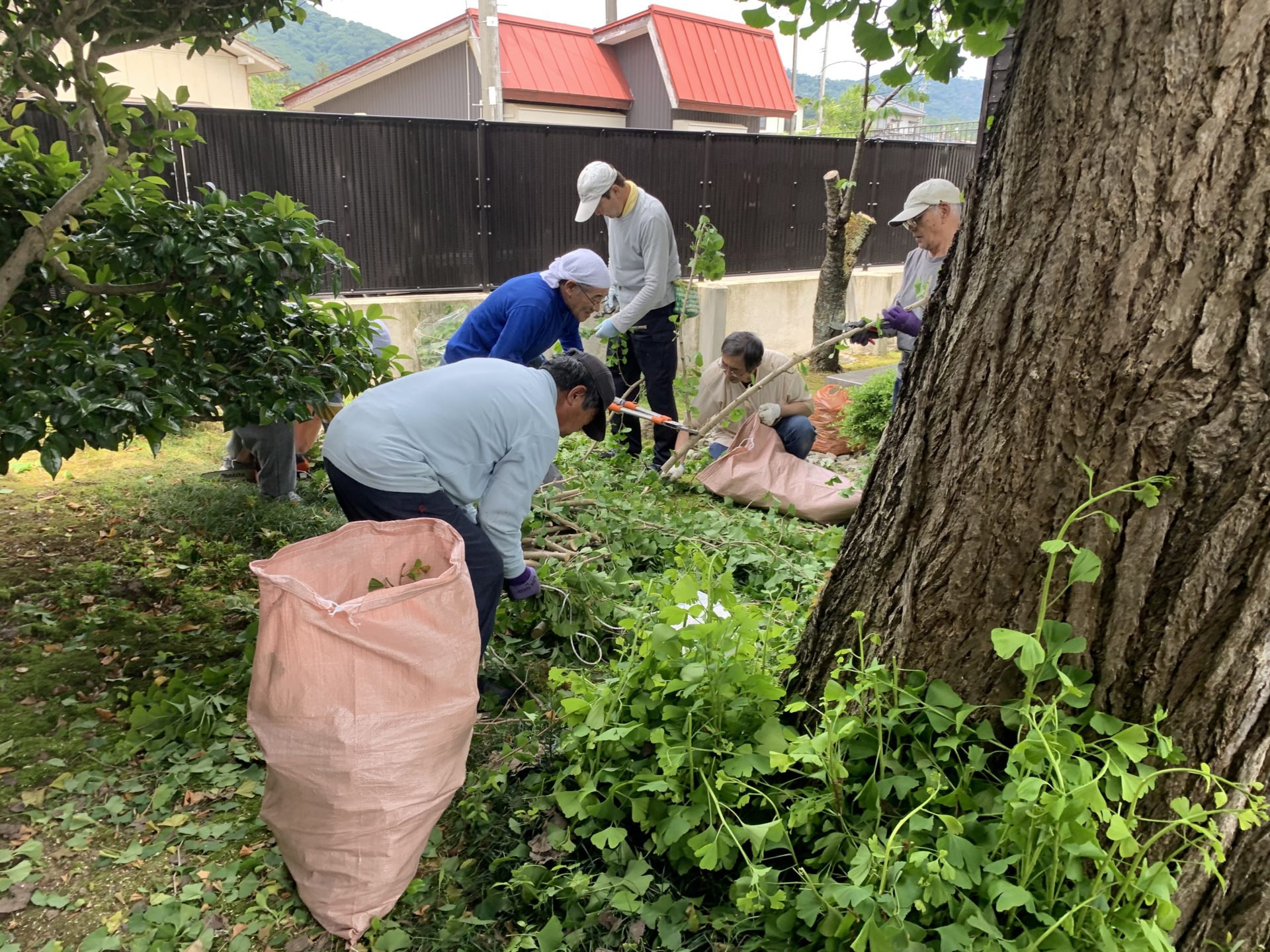 植木の刈り込みと、草むしり、刈った枝のしまつ。